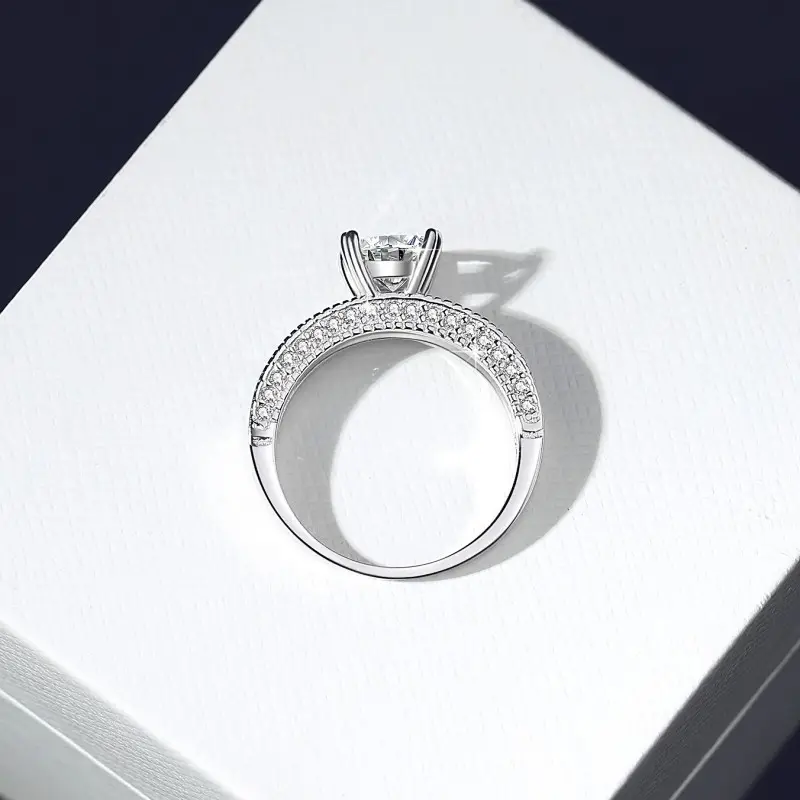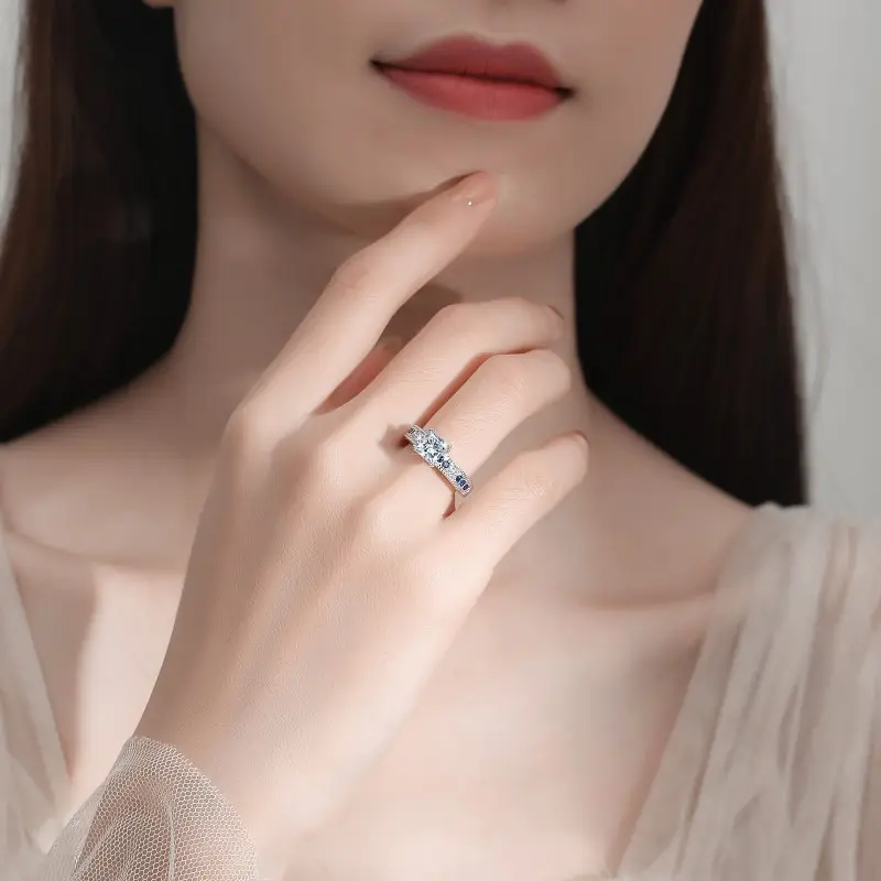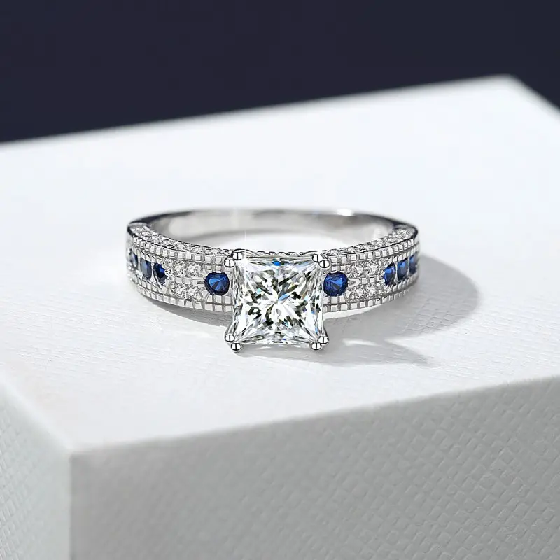 En el centro resalta una imponente moissanita de 1.2 quilates en corte princesa, famosa por sus líneas definidas y su brillo intenso: