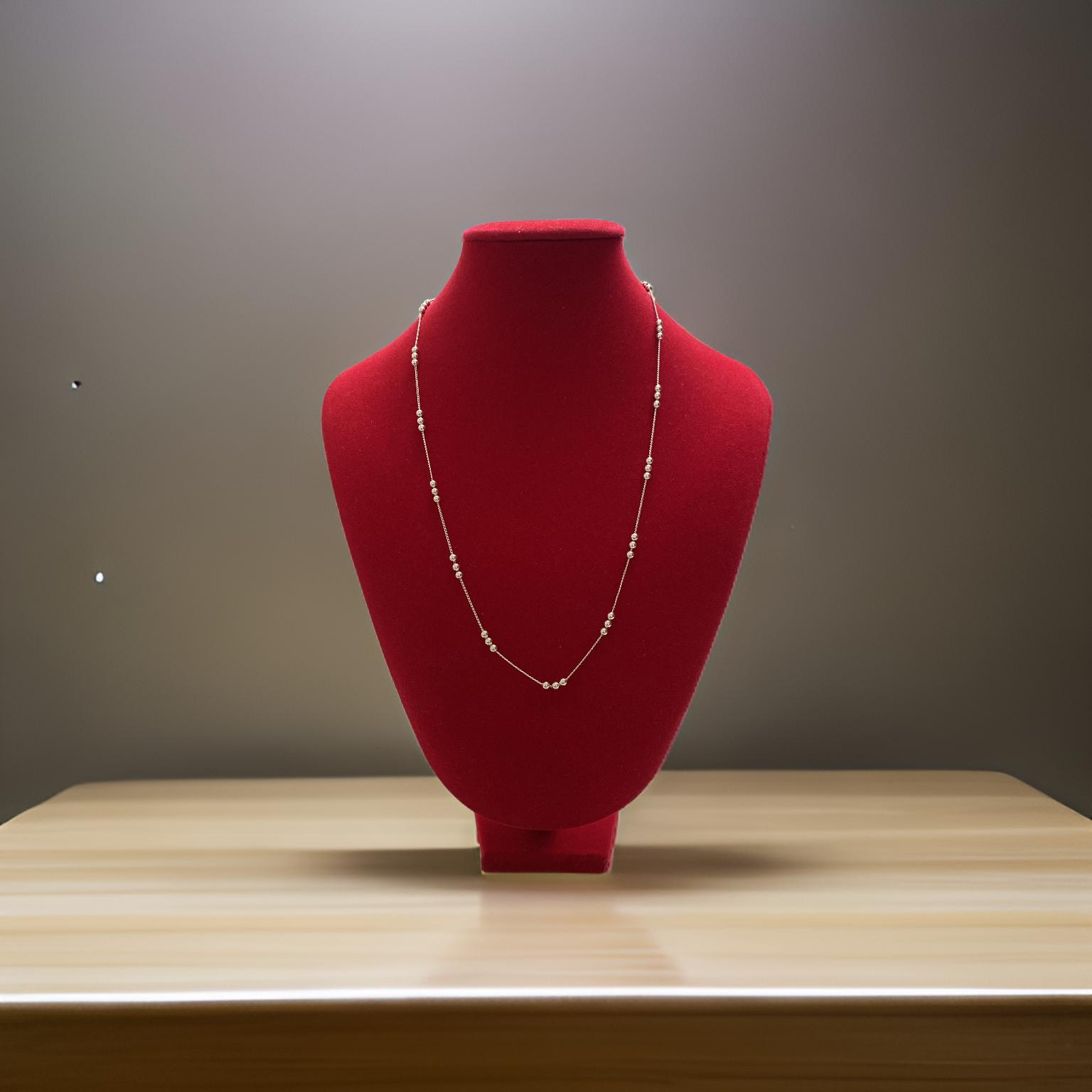 Las delicadas esferas de 3 mm, integradas de forma armónica a lo largo de la cadena, aportan un sutil juego visual y una dimensión moderna que realza su carácter exclusivo. Cada detalle ha sido cuidadosamente trabajado para lograr una pieza refinada, versátil y con identidad propia.